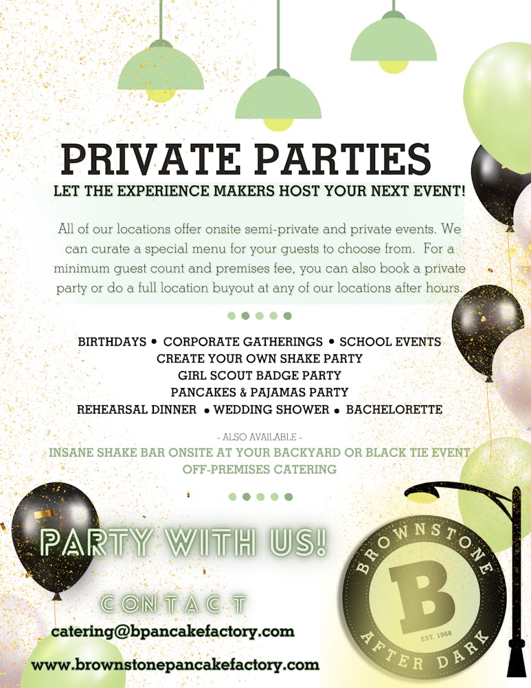 All of our locations offer onsite semi-private and private events for birthdays, rehearsal dinners, corporate luncheons, post-wedding brunches and more! We can curate a special menu for your guests to choose from